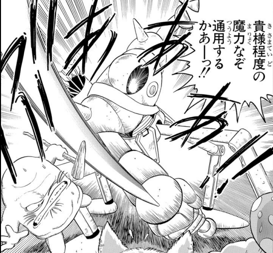 ここではキラーマシーンが登場します。このキラーマシーンは人間が中に乗って操られるのですがこんなアイディアを思いつくことは中々できません。三条先生の思い付き?キラーマシーンはドラクエにはなくてはならないキャラですが、その強さだけでなく無慈悲に人間を殺戮していく機械に子供心に恐怖を覚えたものです。呪文を跳ね返しブラスのメラミもダイのバギクロスも効きません。この現実世界の近未来にAIを搭載したキラーマシーンが人間を襲うようになったら怖いですね。核兵器にも耐えそうです。