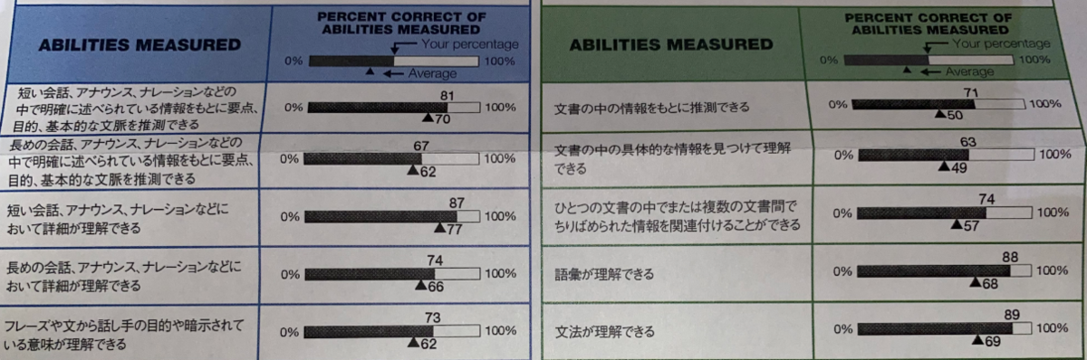 リスニングの減少により点数が劣化。リスニングは点数取得の傾向は変わらずに全体的にわるくなりました。「眺めの会話、アナウンス、ナレーションなどの中で明確に述べられている情報をもとに要点、目的、基本的な文脈を推測できる。」が不得意。2番目と4番目の違いは何かはここで解説がありました。
