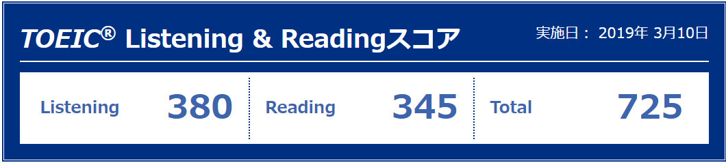 3月10日受験したTOEICの結果が帰ってきました。点数はいつも通りの600点後半~700点台前半です。2年前からあまり変わっていません。600点台になる割合が減った位でしょうか。いつもリーディングのほうが良いのですが、今回はリーディングが下がりリスニングが上がりました。リーディングは文法のpart5に時間をかけすぎたのが良くなかったと思います。と分析してみるも単に読むスピードが遅いだけです。